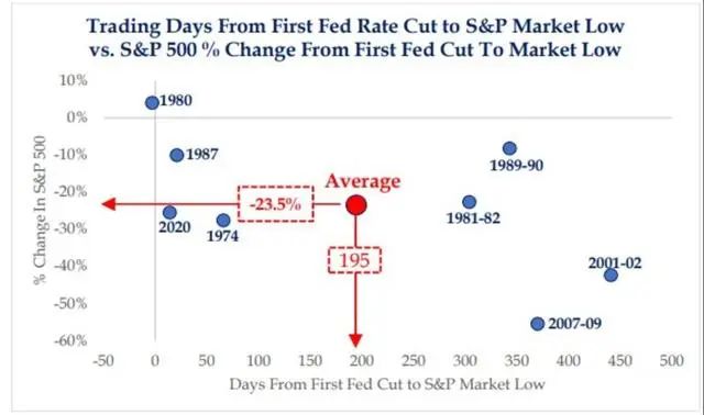 该公司的研究显示,在前几次的宽松周期中,标普500在第一次降息后都出现了下跌,只有一次例外。平均来看,标普在触底前跌幅达到24%。