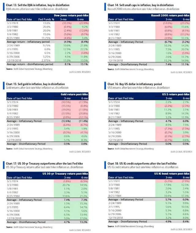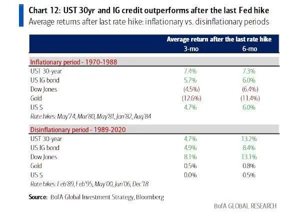 迈克尔·哈特内特(Michael Hartnett)的一项分析显示,在过去30年对抗通胀的历程中,一旦美联储停止加息,股市通常表现优异,但是,在上世纪70和80年代的高通胀时期,美联储在最后一次加息后,股市却下滑了。