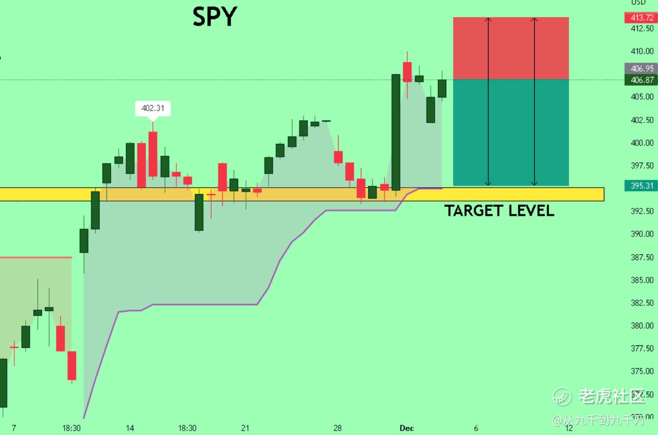 SPY在406附近,我感觉下周如果不能突破410的话,空的面比较大,目标价在395附近,突破413应该稳了可以做多。