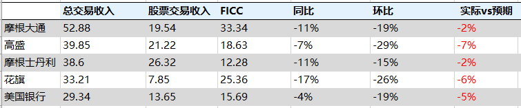 从本季度来看,银行交易收入更多受到FICC业务的拖累,也就是债、汇和大宗商品交易下降较为明显,并且FICC占比较高的$摩根大通(JPM)$ 和$花旗(C)$ 受影响较大。$高盛(GS)$ 的FICC业务表现是同行中最好的,$美国银行(BAC)$ 和高盛的FICC收入降幅要小于摩根大通、$摩根士丹利(MS)$ 和花旗集团10-20%的降幅。