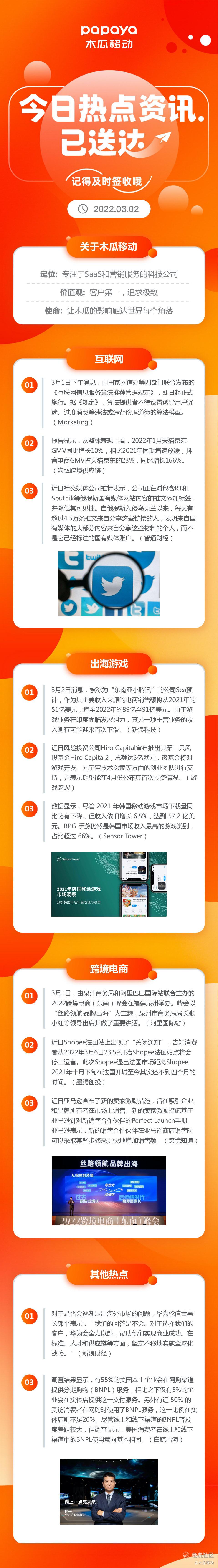 {"i18n":{"language":"zh_CN"},"detailType":1,"isChannel":false,"data":{"magic":2,"id":632130153,"tweetId":"632130153","gmtCreate":1646286191643,"gmtModify":1646286191643,"author":{"id":4100155604997860,"idStr":"4100155604997860","authorId":4100155604997860,"authorIdStr":"4100155604997860","name":"木瓜移动","avatar":"https://static.tigerbbs.com/e2acdcf9db2f95792394a8d8e15ba56e","vip":5,"userType":5,"introduction":"专注于SaaS领域和出海营销服务的科技公司","boolIsFan":false,"boolIsHead":false,"crmLevel":1,"crmLevelSwitch":0,"individualDisplayBadges":[],"fanSize":282,"starInvestorFlag":false},"themes":[{"themeId":"309c7f94260944df9570069109a44aae","categoryId":"bc7f9e79615545918dda2e7d7cfb9e15","name":"市场大事","type":0,"rnLink":"https://laohu8.com/RN?name=RNTheme&page=/theme/detail&rndata={\"themeId\":309c7f94260944df9570069109a44aae}&rnconfig={\"headerBarHidden\": true}","description":"宏观大事,市场动态","image":"https://static.tigerbbs.com/9eaf0bfce8dcfc7bf515f26e2cfe3f9e"}],"images":[{"img":"https://static.tigerbbs.com/cbb76315ea26874227b77dab9cf72e33","width":"632","height":"4546"}],"coverImages":[{"img":"https://static.tigerbbs.com/cbb76315ea26874227b77dab9cf72e33","width":"632","height":"4546"}],"title":"木瓜移动今日热点资讯请注意查收~","extraTitle":"","html":"<html><head></head><body><p>由木瓜移动搜集的今日热点资讯请注意查收~</p><p>资讯主要分成互联网、出海游戏、跨境电商、其他热点等部分组成</p><p>快来看看今天又发生了哪些事情吧~</p><p class=\"t-img-caption\"><img src=\"https://static.tigerbbs.com/cbb76315ea26874227b77dab9cf72e33\" tg-width=\"632\" tg-height=\"4546\"></p></body></html>","htmlText":"<html><head></head><body><p>由木瓜移动搜集的今日热点资讯请注意查收~</p><p>资讯主要分成互联网、出海游戏、跨境电商、其他热点等部分组成</p><p>快来看看今天又发生了哪些事情吧~</p><p class=\"t-img-caption\"><img src=\"https://static.tigerbbs.com/cbb76315ea26874227b77dab9cf72e33\" tg-width=\"632\" tg-height=\"4546\"></p></body></html>","text":"由木瓜移动搜集的今日热点资讯请注意查收~ 资讯主要分成互联网、出海游戏、跨境电商、其他热点等部分组成 快来看看今天又发生了哪些事情吧~","highlighted":1,"essential":1,"paper":2,"likeSize":0,"commentSize":0,"repostSize":0,"favoriteSize":0,"link":"https://laohu8.com/post/632130153","repostId":0,"isVote":1,"tweetType":1,"viewCount":22894,"commentLimit":10,"likeStatus":false,"favoriteStatus":false,"reportStatus":false,"symbols":[],"verified":2,"subType":0,"readableState":1,"langContent":"CN","currentLanguage":"CN","warmUpFlag":false,"orderFlag":false,"shareable":true,"causeOfNotShareable":"","featuresForAnalytics":[],"commentAndTweetFlag":false,"andRepostAutoSelectedFlag":false,"upFlag":false,"length":125,"xxTargetLangEnum":"ZH_CN"},"commentList":[],"isCommentEnd":true,"isTiger":false,"isWeiXinMini":false,"url":"/m/post/632130153"}