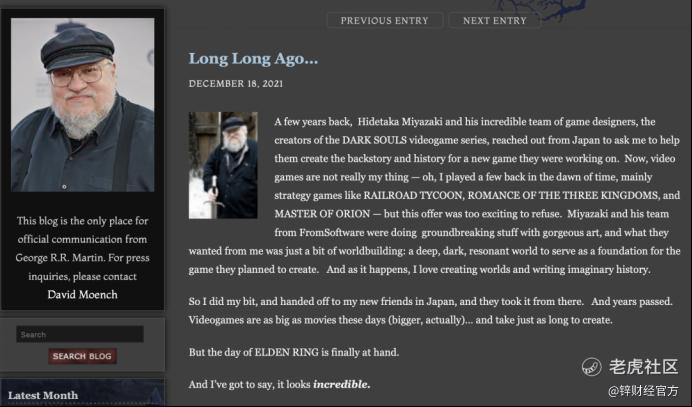 乔治·马丁作为《艾尔登法环》游戏世界观的架构者,自己却不是一个游戏爱好者。但也正因为这样,马丁可以以一个独立的视角跳出游戏本身,为每一个游戏玩家和角色构建一个全面的世界观。