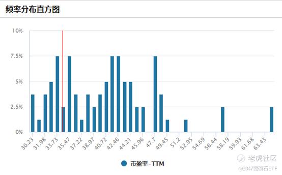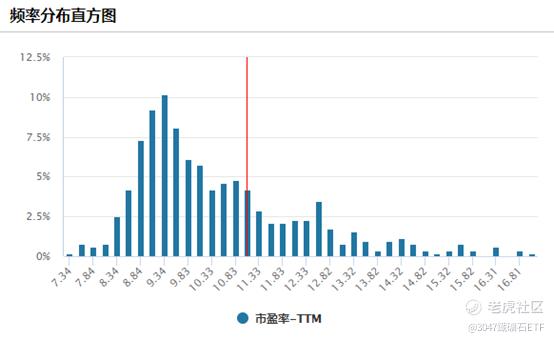 我們也可以用頻率分佈長條圖作為比較的工具,紅色線是當前值,可以看得到“比現在市盈率水準低的時間很多”,所以現在是較高的水準,不用急住入市