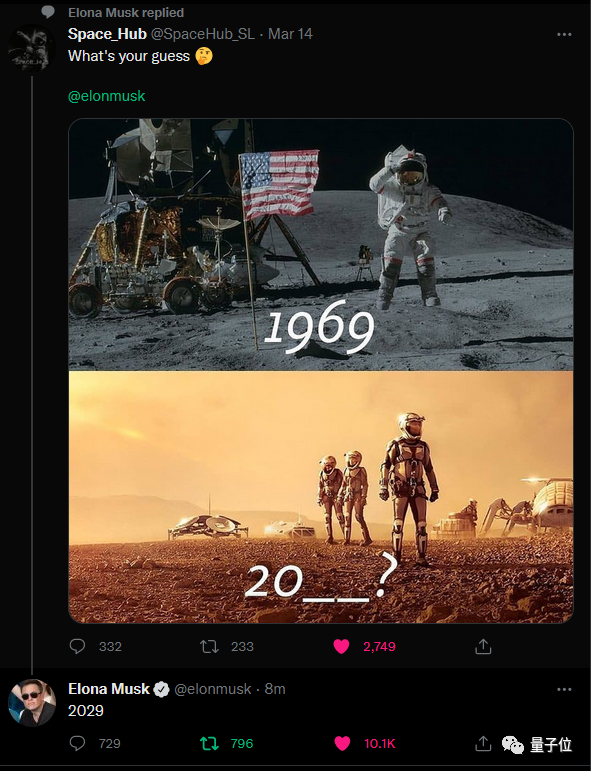 以及就在最近,马斯克对于人类登火星,给出了一个时间点——2029年: