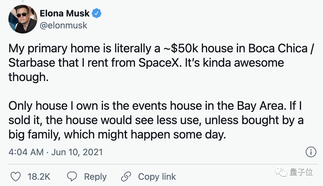 去年,他还透露道,自己目前的住所是位于Boca Chica(也叫starbase)区域的一间不到40平米(20英寸×20英寸)的出租屋内。