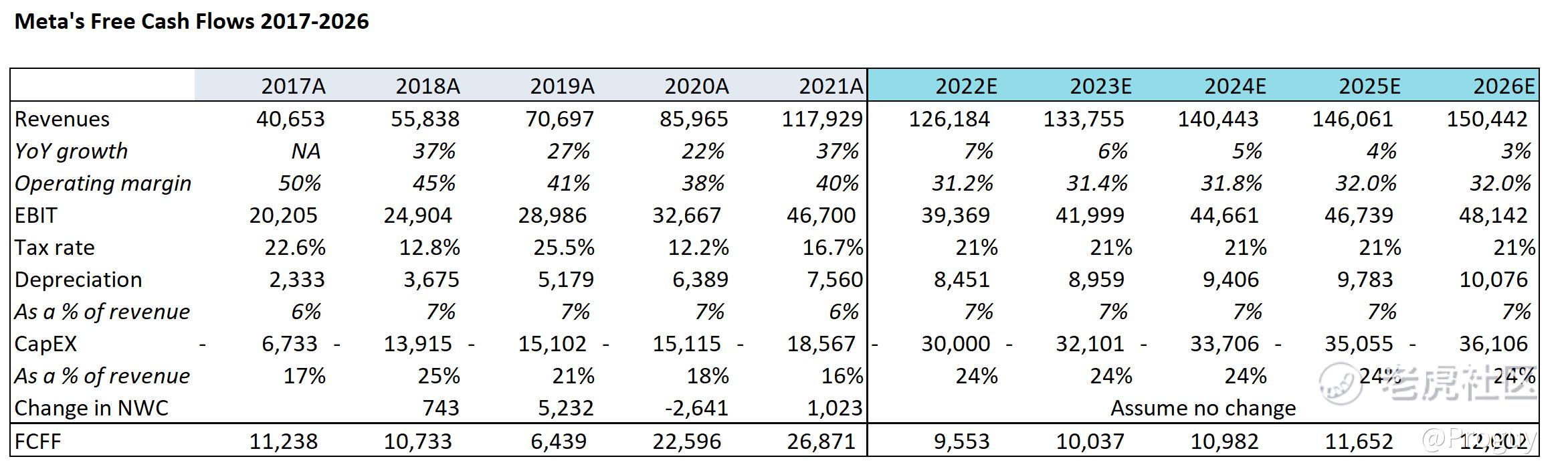 In my forecasts for Meta, I assumed revenue would grow 7% this year which is in the middle of the forecast range given by management (3-11% annual growth). EBIT was calculated using an operating margin of around 32% which is based on analysts' forecasts for the company. Depreciation is projected to be 7% of revenue based on a historical average and Capex is projected to increase to 24% of revenue as spending on the Metaverse increases. As NWC showed no historical pattern, it was assumed to remain constant.