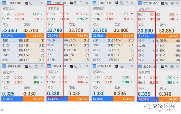 如上图所示,当窝轮的价格从0.325涨到0.330时,正股的价格为33.70,即0.330的转价位是33.70。同理,0.335的转价位是33.80。
