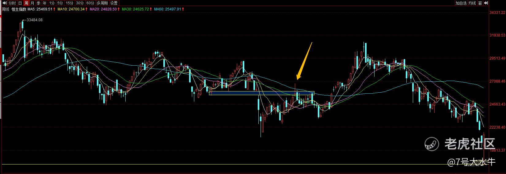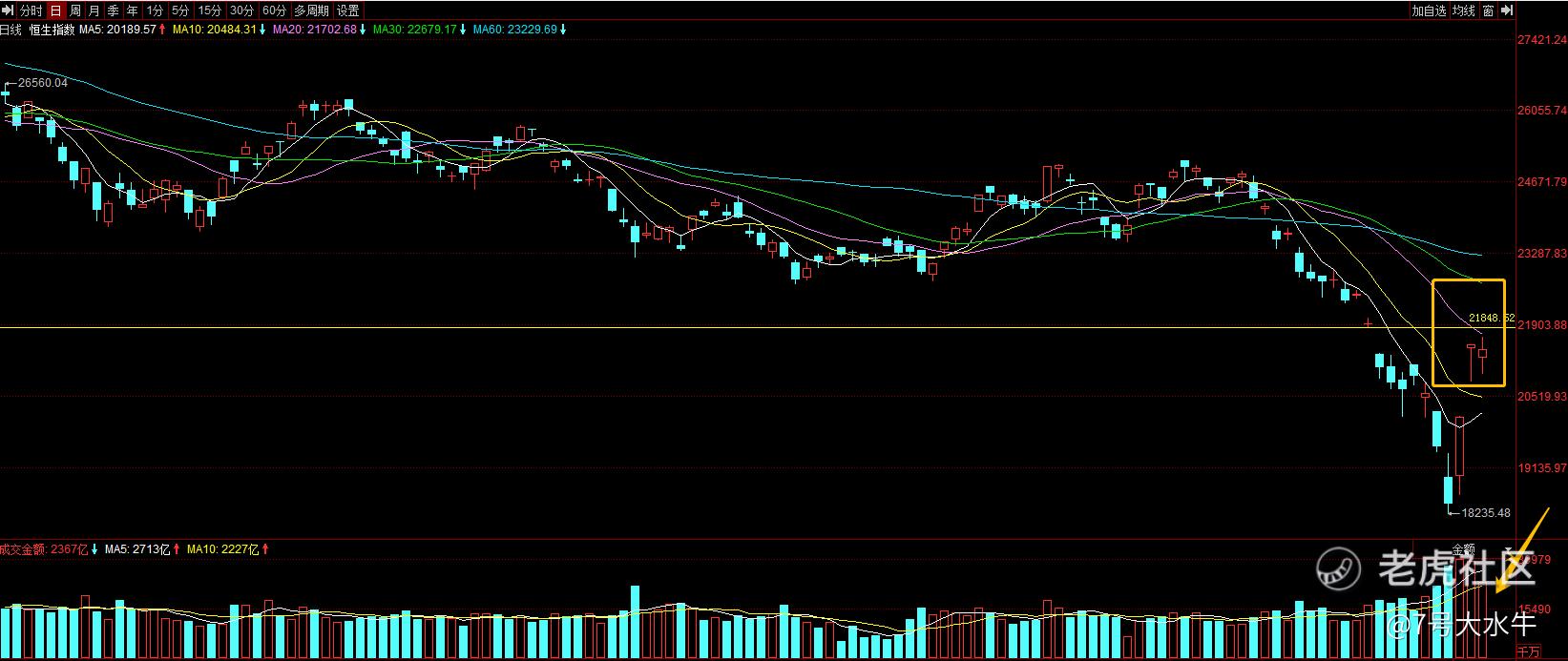 - 收盘价低于昨天,昨天恒指收盘20501,今天只有21412,也是强转弱的表现。