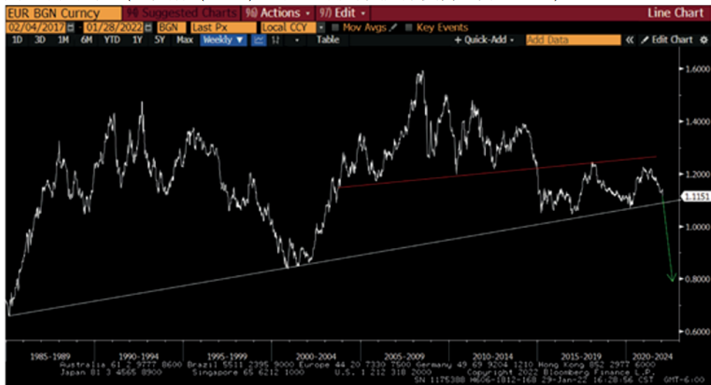欧元是美元指数最重要的组成部分,如果看图表,美元的长期下跌趋势已经逆转;自 2011 年以来,弱美元一直是许多机构宏观框架的一部分。但如果这在短期内被证明是一种盘整模式(从2011至今),那么目前我们将迎来美元的大幅反弹,而并不是因为避险因素导致的美元短期反弹。