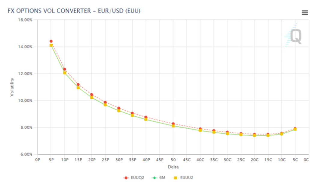 从下图的波动率微笑曲线角度也可以看出,现在欧元/美元的看跌期权隐含波动率(微笑曲线左侧)远高与看涨期权隐含波动率(微笑曲线右侧)。