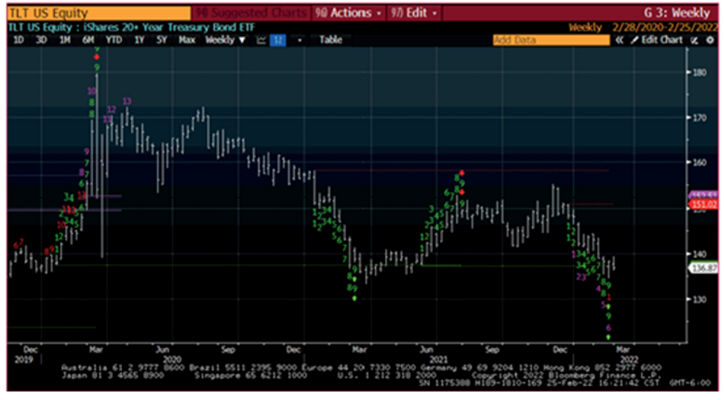 如果我们使用 TLT (美国20年以上国债ETF)来观察,Demark指标目前是完美的反弹信号。这暗示着,超长期美债收益率也在面临不仅是由于短期避险盘带来的下跌,而是面临着由于东欧局势长期化动荡导致的世界经济萧条预期导致的超长期美债期限溢价下行。