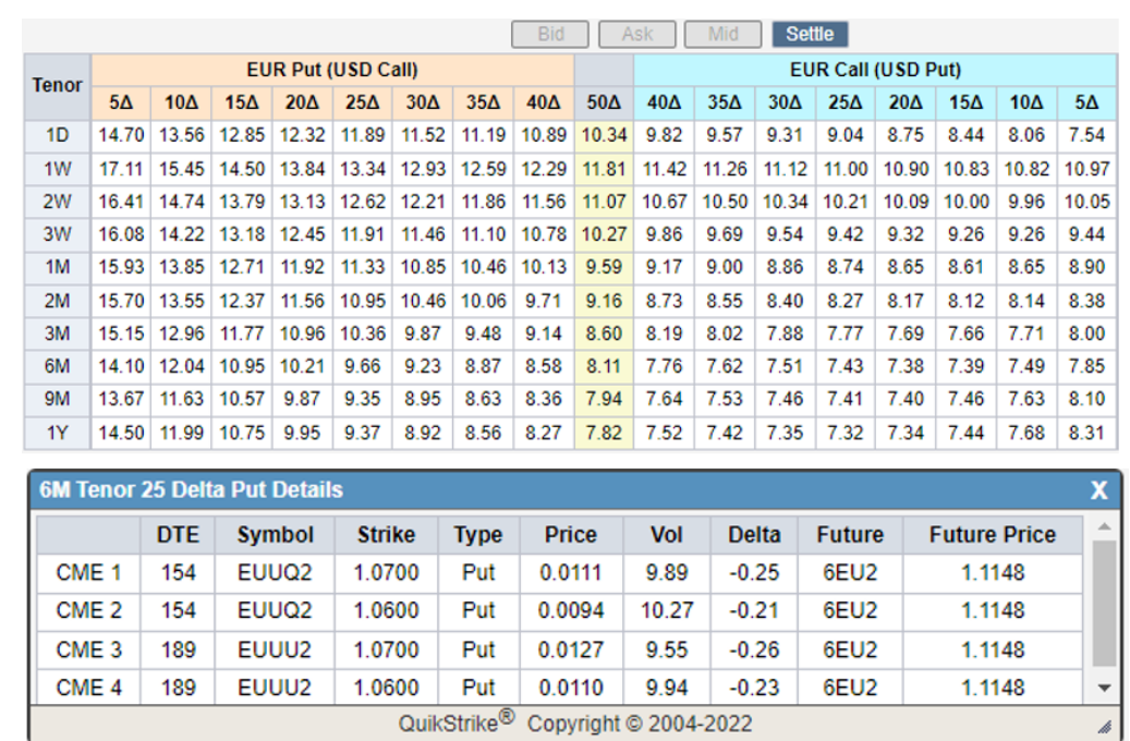 比如下图1中,我们可以点击6M 25 Delta EUR put,工具就会弹出相应的看跌期权(下图2),交易者就可以选择相应的期权。
