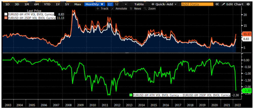 首先,由于乌克兰局势的风险快速上升,欧元下行风险也同时快速上升,对冲需求上升因此欧元虚值看跌期权价格大幅度上升,导致现在的波动率偏度(volatilityskew)上升 。