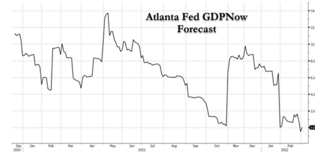 食品和能源更类似一种外生性的冲击。政府发票子大家去买更好的房子车子,和政府发票子去弥补大家因为生活必须品价格上涨造成的损失,哪个经济体更加健康,家庭部门“体质”更强健,不言而喻。而更健康的那位,亚特兰大美联储下调了经济增长估计,将GDP预期从1.7%削减到接近0.0%。