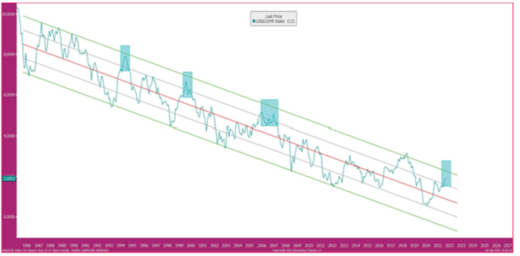 我们都知道美国十年期国债收益率仍处于一个长期下降的通道中(上图),而容易被忽视的技术细节是,收益率没有一次上涨就达到了通道的顶部!除 2018 年外(上图),大多数情况下它都停止在 2 个标准差水平以下。