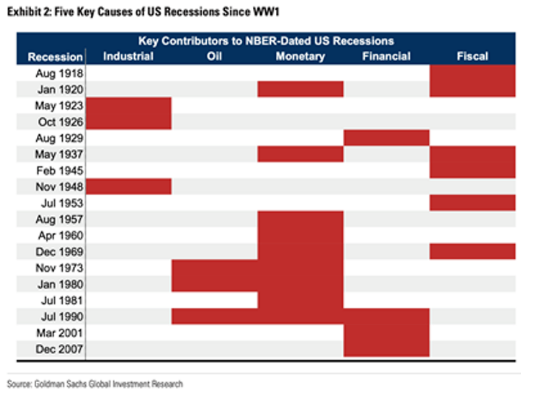 图:从美国一战以来的历次衰退中,高盛总结了5大主要因素