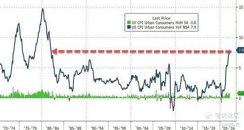 在今天美国公布的2 月份CPI数据显示,与去年相比上涨了7.9%,创下 1982 年以来最快的年度涨幅。