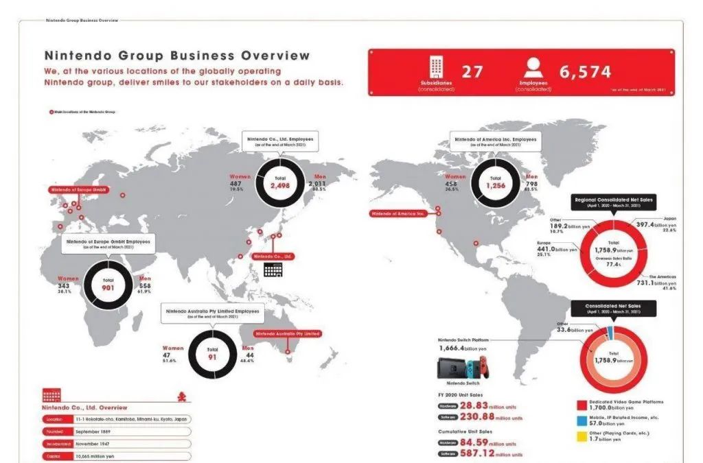 以任天堂举例。根据官方去年7月发布的《2021年度企业社会责任报告》,任天堂在全球共有27个团队,员工总数达到了6574人。各区域分布上,亚洲地区员工数量最多,达到了2498人。第二则是美国任天堂,为1256人,占比约20%。欧洲以901人位居第三,占比14%。