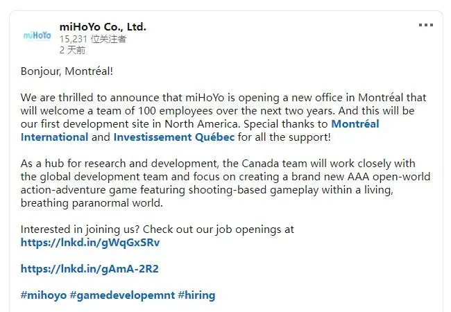 腾讯、网易自然不必多言,除去两者外,米哈游、三七互娱、心动等公司均以开始着手。去年11月,米哈游就在领英平台发布消息,宣布将在蒙特利尔建立百人级别的研发工作室,践行“全球化研发”的模式。据最新资料显示,米哈游已经在上海、东京、首尔、新加坡、蒙特利尔、洛杉矶设有分支机构和办公室,总员工数超过4000人。