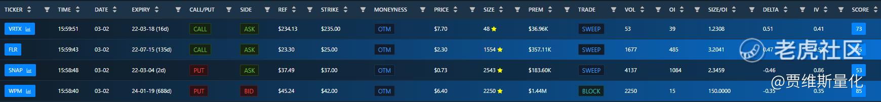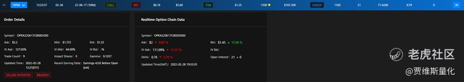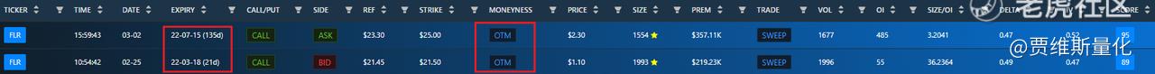 注意 短期虚值期权异动 。如果 单笔大单异动伴随高成交量与短期合约到期日 ,表明有大资金持有者针对短期波动性下大注,市场有可能在短期迎来较大的动作。如下图所示两张FLR期权异动,相较第一笔大单异动,第二单具有 更近的到期日与更短的合约期限 ,同时合约成交量相当,对于短期市场波动可能更具借鉴性。