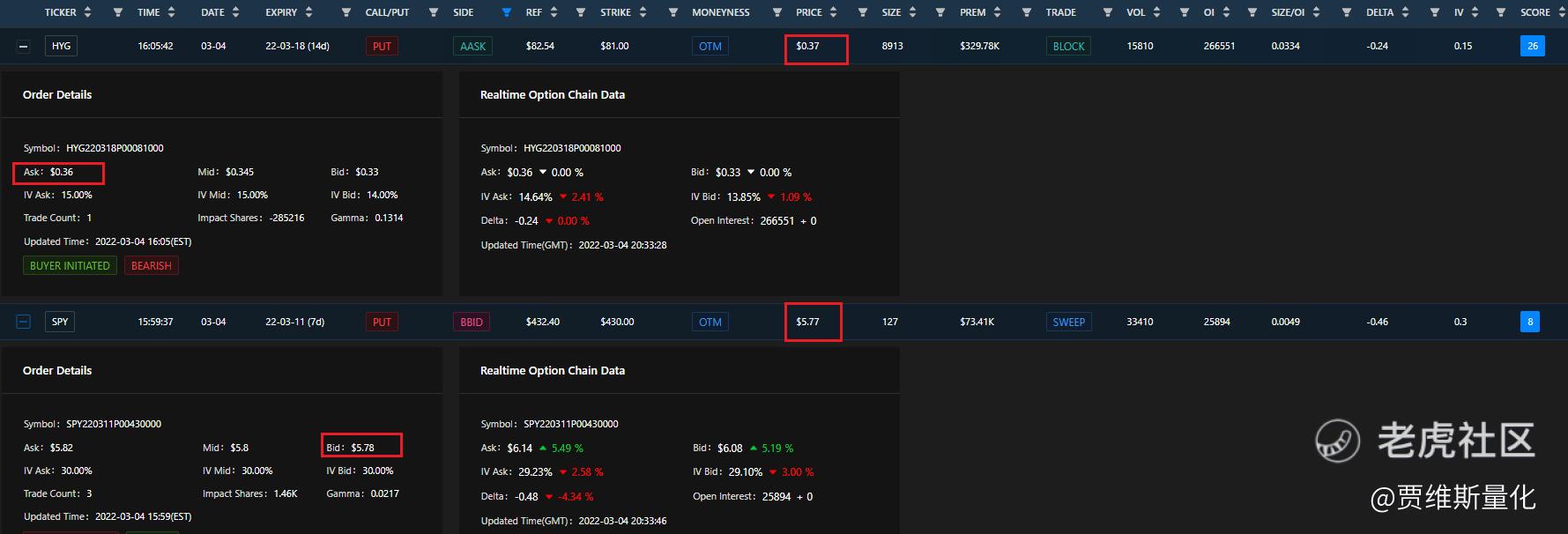 需要注意 看涨的卖空期权与看跌的卖多期权 。低于市场成交价的卖空订单流(往往在合约价格信息后面出现BB标志的卖空期权信息,表示Below Bid)相对市价成交的卖空订单显示出更强的看涨倾向,高于市价的买空订单(往往出现AA标志的买空期权信息,表示Above Ask)相对市价成交的买空订单显示出更强的熊市看跌倾向,两者都表明交易者愿意以劣于市场成交价的价格成交以换取早入场的机会。相对应的,低于市价的卖多期权显示出强看跌意愿而高于市价的买多期权显示出强看涨意愿。