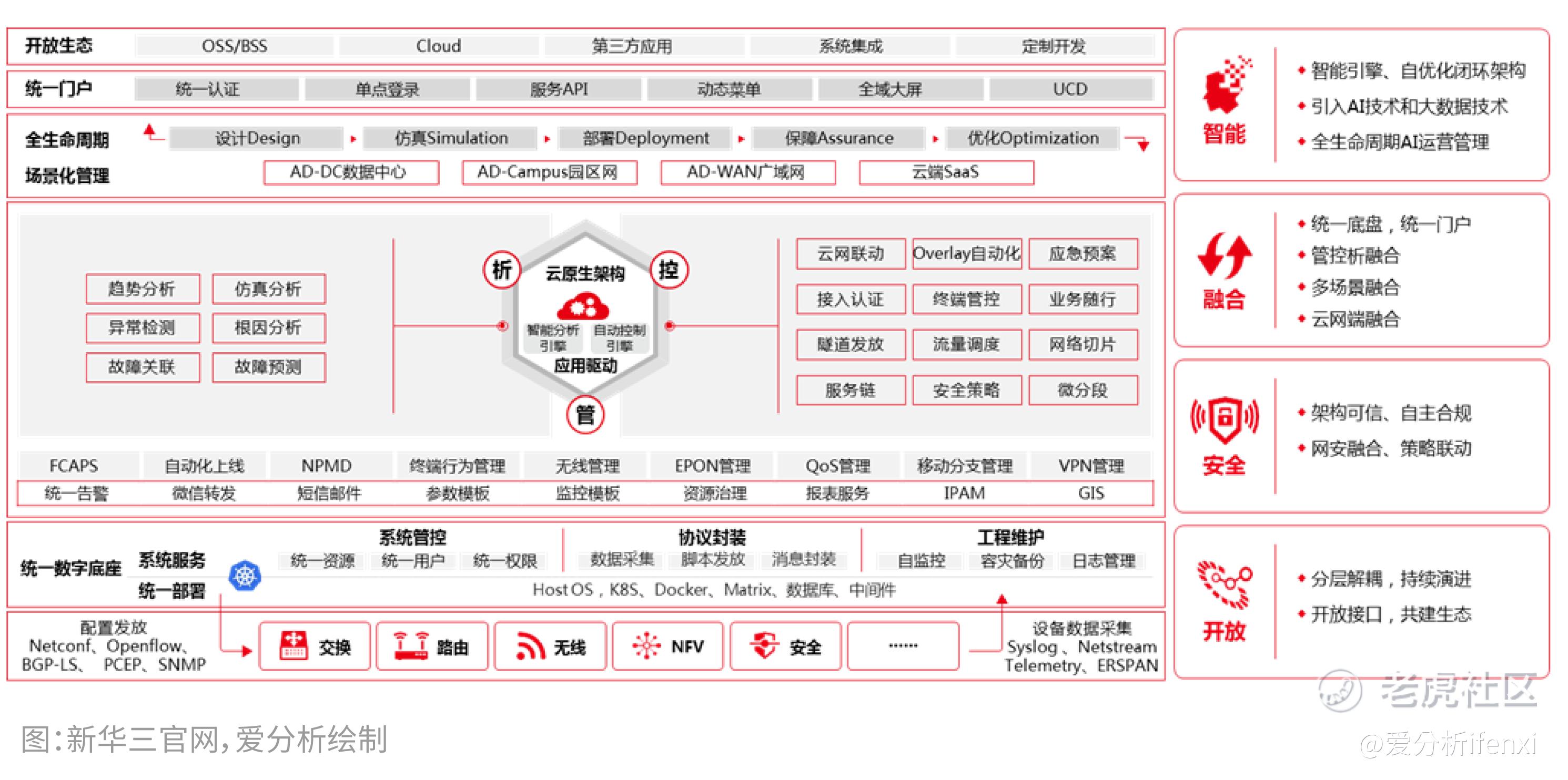 AD-WAN解决方案基于新华三融合、安全、开放、智能的SDN网络架构。统一融合大数据智能分析、SDN控制器、网络管理,实现“管”、“控”、“析”三维一体的融合网络控制中枢和智能大脑,网络全域覆盖,端到端的业务编排。面向用户、统一Portal,真正做到“一次登录、一键发放、一体保障、一站运维”;结合大数据分析与AI学习能力,抓取网络实时快照、离线建模,实现网络的智能洞察、智能仿真与智能排错,助力广大企业用户实现数字化网络智能升级。