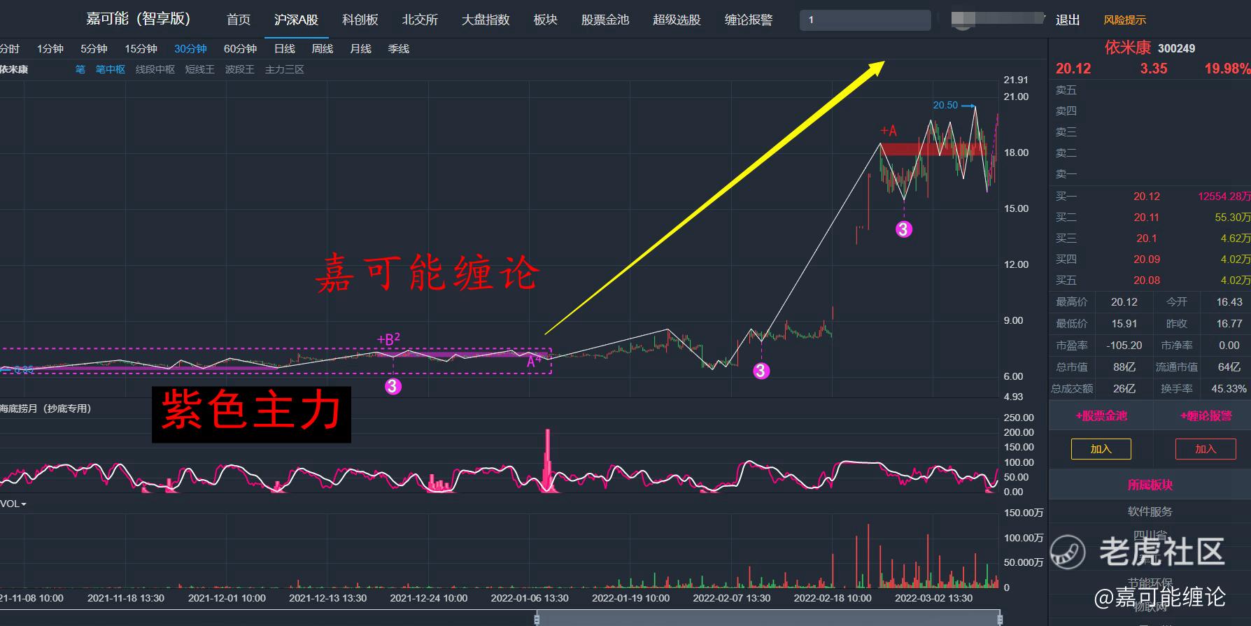 软件板块的牛股-依米康(300249)今天也是继续20CM涨停板,它条件就更加夸张了,完全符合四大条件。如下图所示: