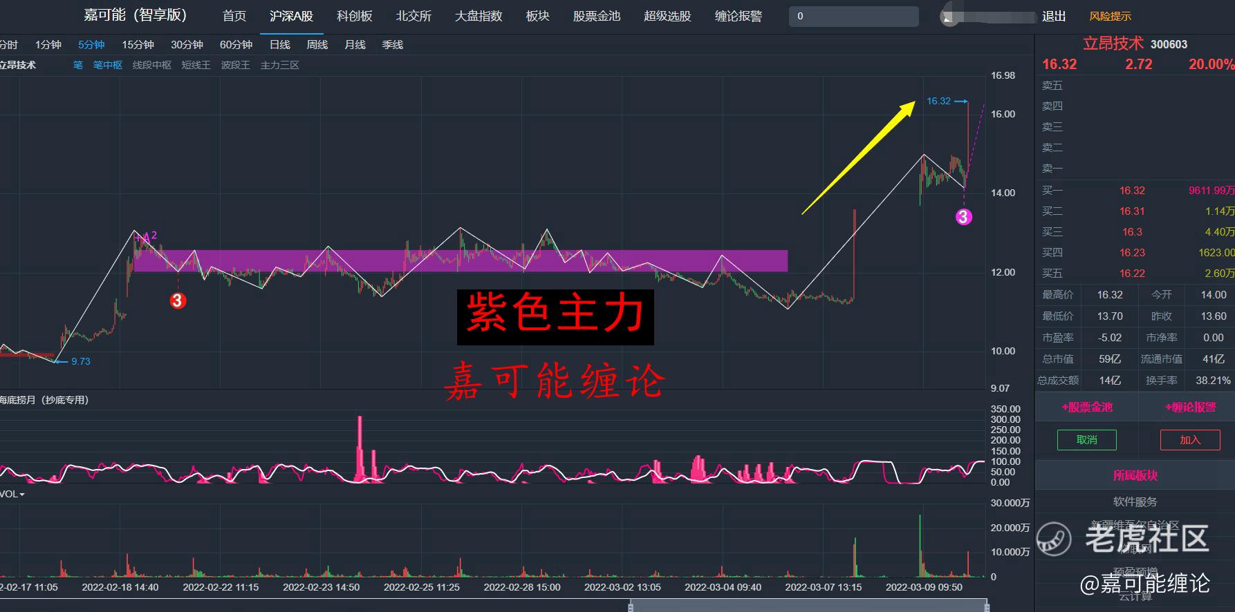 立昂技术(300603)今天应该属于放量了,成交量比昨天还要多大一些。5分钟继续保持缠论强势信号-紫色主力,如下图所示: