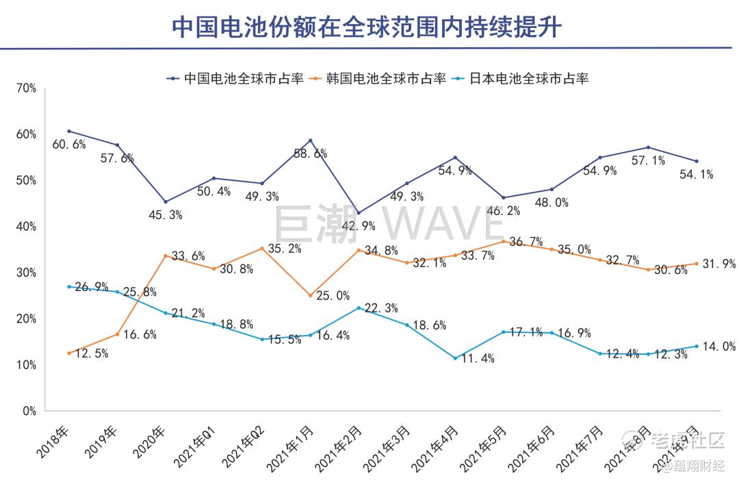 与股价相对应的是,根据韩国SNE新出炉的数据显示,2021年宁德时代在国际和国内上的市场占有率却在持续提升:宁德时代在全球的市场占有率超过了32.6%,国内继续保持50%以上。