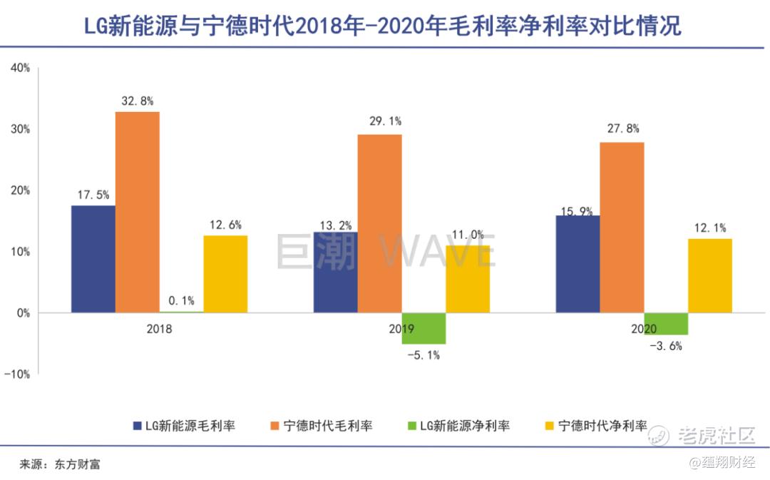 再拆开报表揉碎了看看,LG新能源与宁德时代的毛利率2018年到2020年三年分别为,17.5%、13.2%、15.9%和32.8%、29.1%、27.8%,净利率分别为0.1%、-5.1%、-3.6%和12.6%、11.0%、12.1%,LG新能源基本只有宁德时代的一半。