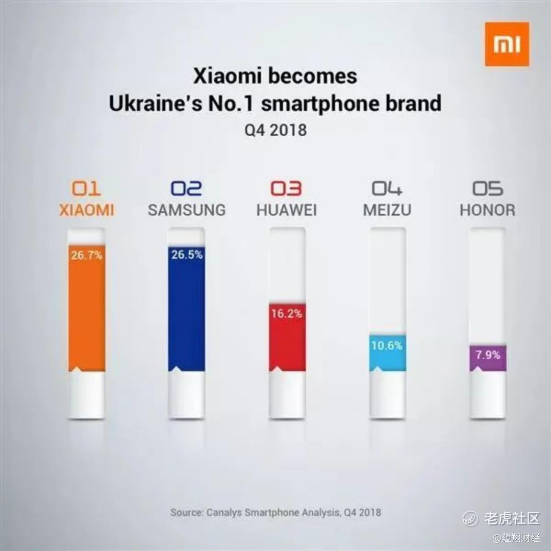 Canalys数据显示,2018年第四季度,小米手机在乌克兰的市场份额达到26.7%,赢得乌克兰智能手机销量冠军,此后销量也一直稳居前列。