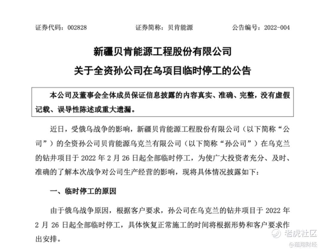 不过贝肯能源就没这么幸运了,今日下午,贝肯能源公告,公司全资孙公司贝肯能源乌克兰有限公司在乌克兰的钻井项目于2022年2月26日起全部临时停工。何时可以恢复正常施工暂时无法预计,预期会对项目进度和经营产生不利影响。