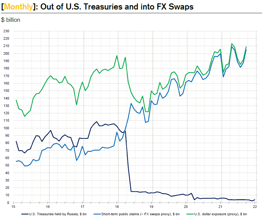俄罗斯央行在2018年开始大量抛售美国国债(蓝线)而增持FX Swaps