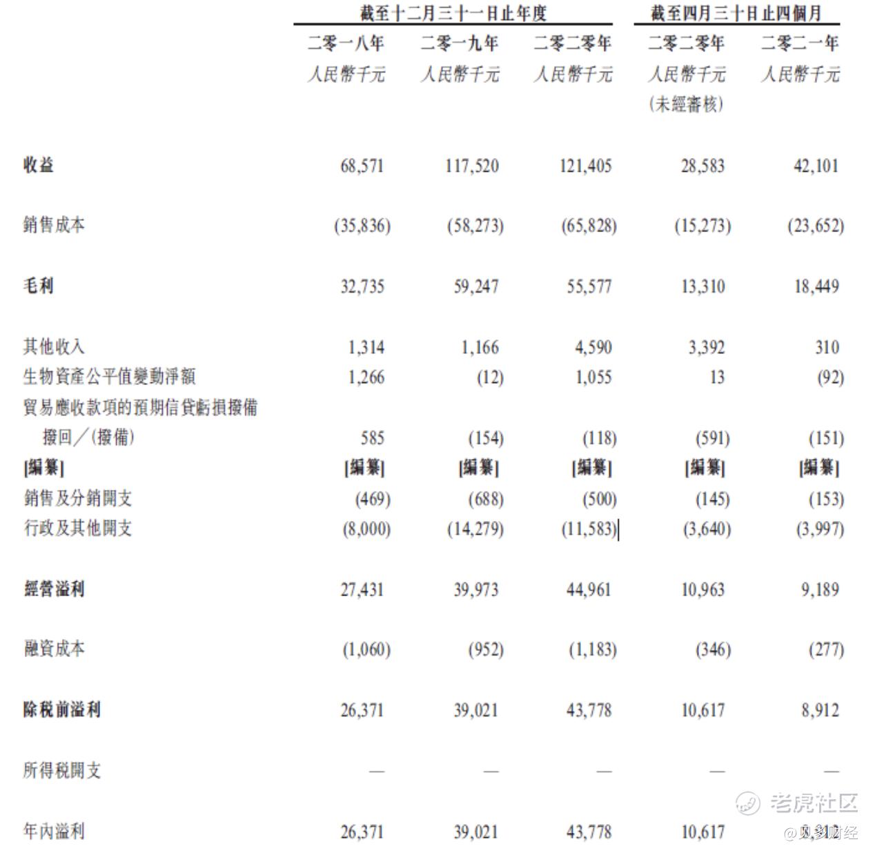 根据招股书,2018年、2019年、2020年和2021年前4个月,富景农业的营业收入分别为 6857.1万元、1.28亿元、1.21亿元和4210.1万元,净利润分别为 2637.1万元、3902.1万元、4377.8万元和891.2万元。