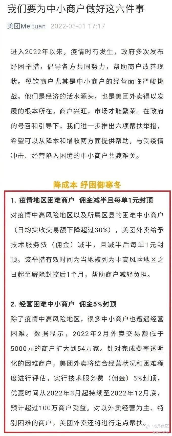 美团也开始答题。3月1日,美团宣布,从今年3月到12月,对疫情中高风险地区经营困难的中小商户,美团外卖实行技术服务费(佣金)减半优惠,且减半后每单1元封顶;对其他完成费率透明化的困难商户,实行技术服务费5%封顶,预计超百万商户受益。