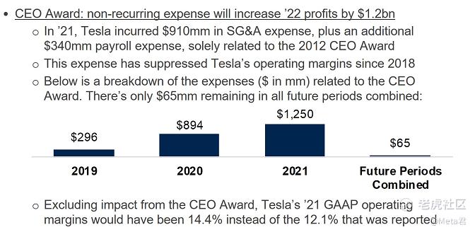 如果我们把这个数字从2021年的财务报表中剔除,实际上特斯拉的GAAP运营利润率应该能够达到14.4%,而不是报告中的12.1%。