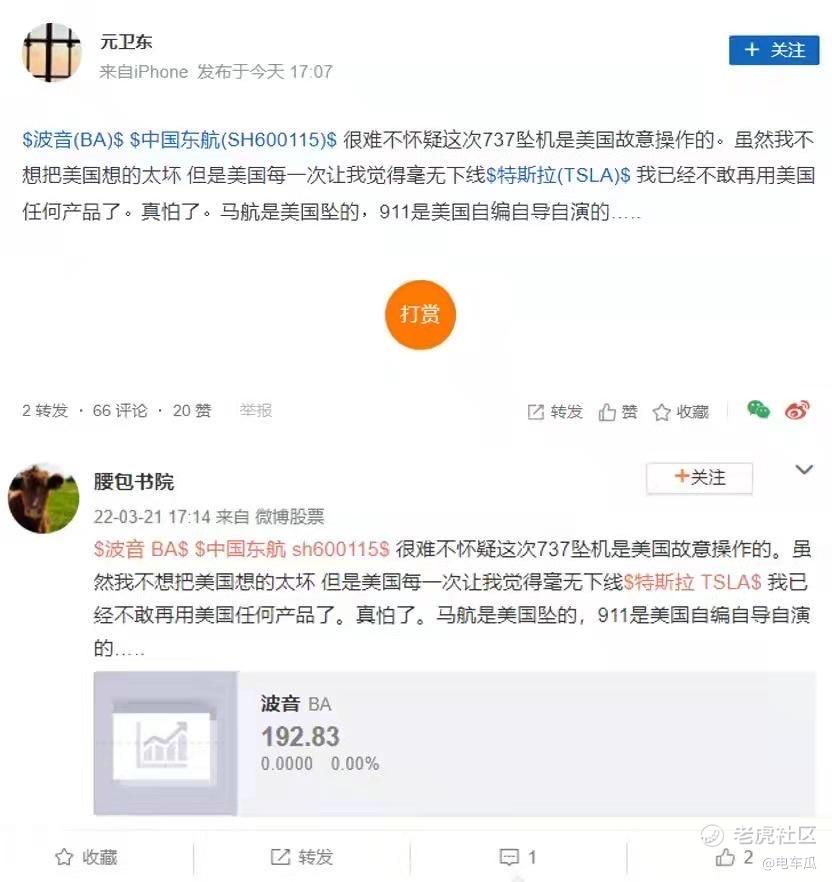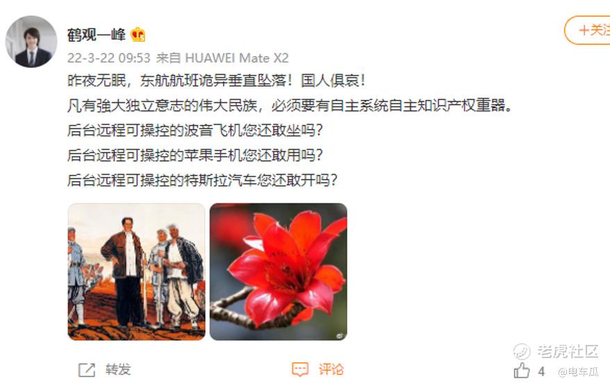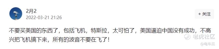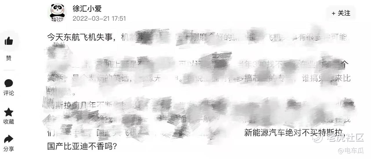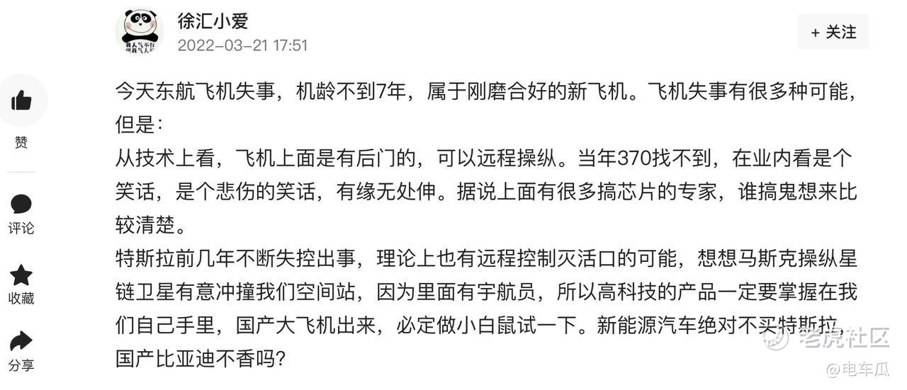 暂且不看中间毫无根据的臆测,只看开头和结尾。通过开头“今天东航飞机失事”是如何能够推导出“新能源汽车绝对不买特斯拉,国产比亚迪不香吗?”这样的结论的,简直令人匪夷所思。