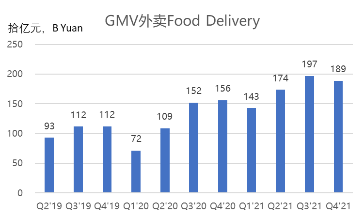 外卖业务在2021年Q4获得收入261.3亿元21.3%,同比增长,经营利润为17.4亿元,去年同期为8.8亿元;利润率为44.7%,超过市场预期共识的40.8%。其中餐饮外卖配送成本为183亿元。