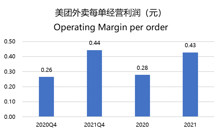 同时,我们也可以看到,Q4的外卖交易金额(GMV)同比上升了20.7%至1886亿元,而交易笔数也上升17.4%至39.1亿单。每位用户的平均年交易单数为35.8单,同比上升27.2%。Q4的每单经营利润为0.44元。