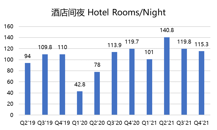 Q4酒店间夜量同比下降3.7%至115.3。不过全年境内酒店的间夜量增长34.5%,其中高星级酒店占比超过16.5%。