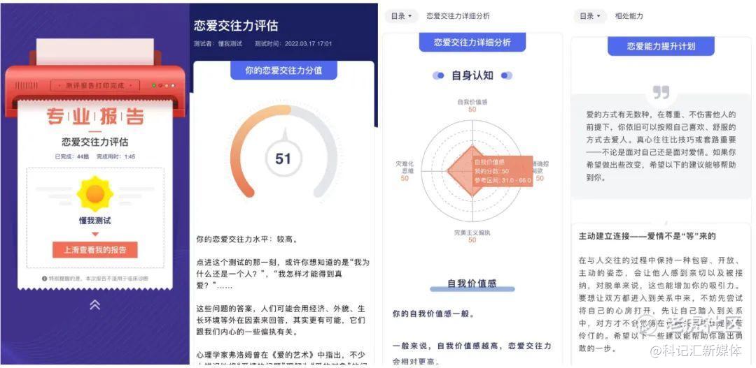 首批上线的测试包括情感、婚姻、人际、成长四大类别,总计19个专业测试主题。