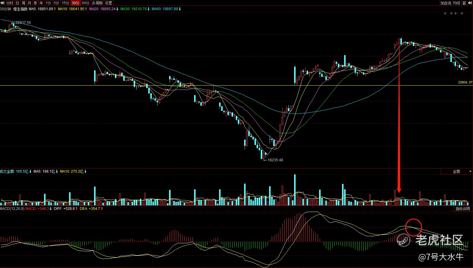 上周23号的30分钟图显示,也就是箭头指向的这根K线,价格创新高,但是成交量萎缩,随后出现圆圈的量价背离信号,也是多头转向空头的信号之一。