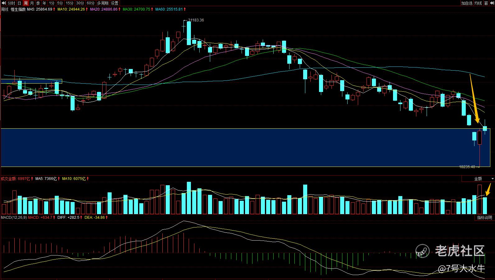 趋势方面,恒指依然处于下降趋势线的下方,说明目前趋势依然是空头排列,细节上来看,上周最高价22423.51,,连上方22709的压力位都没有摸到,周线上收出一根长上引线,说明从23号开始多方力量衰竭,预计空头开始接管市场。