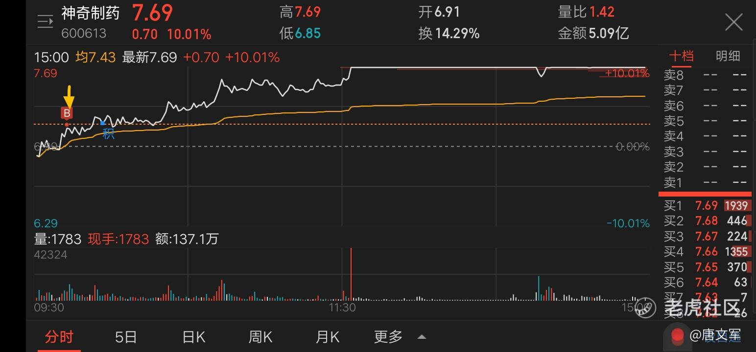 今天上午在9:42以7.19的价格买入$神奇制药(600613)$,截止收盘收于7.69,目前浮盈有7个点。