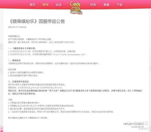 《糖果缤纷乐》国服宣布停运,关闭下载入口