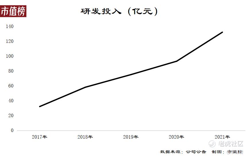 小米的研发投入从2017年的32亿元增长到2021年的132亿元,其中2021年同比增长42.3%,研发投入进入了中国高科技公司的前20位。