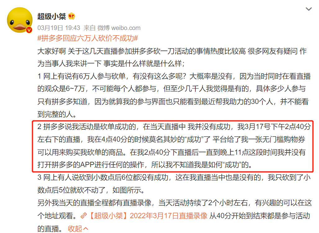 但其实根据主播本人的微博表示,他在3月17号下午2点40分左右下的直播并停止了砍单,而在4点40分的时候莫名其妙的“成功”了,平台给了他一张无门槛购物券可以用来购买砍单的商品。