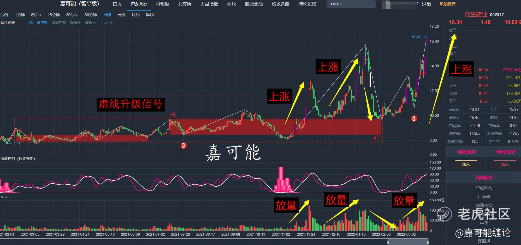 众生药业(002317)也是一样的,放量上涨,缩量回调,再次放量上涨,相比于红日药业(300026),众生药业(002317)属于短期内第三波了,估计目前属于短线主力加速拉升阶段了,如下图所示: