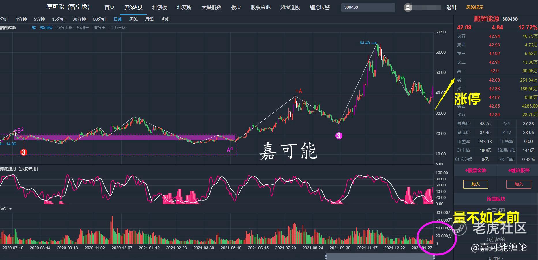 比如鹏辉能源(300438)N倍上涨后的回撤,今天是放量涨停的,但是量已经不如前面的了,如下图所示: