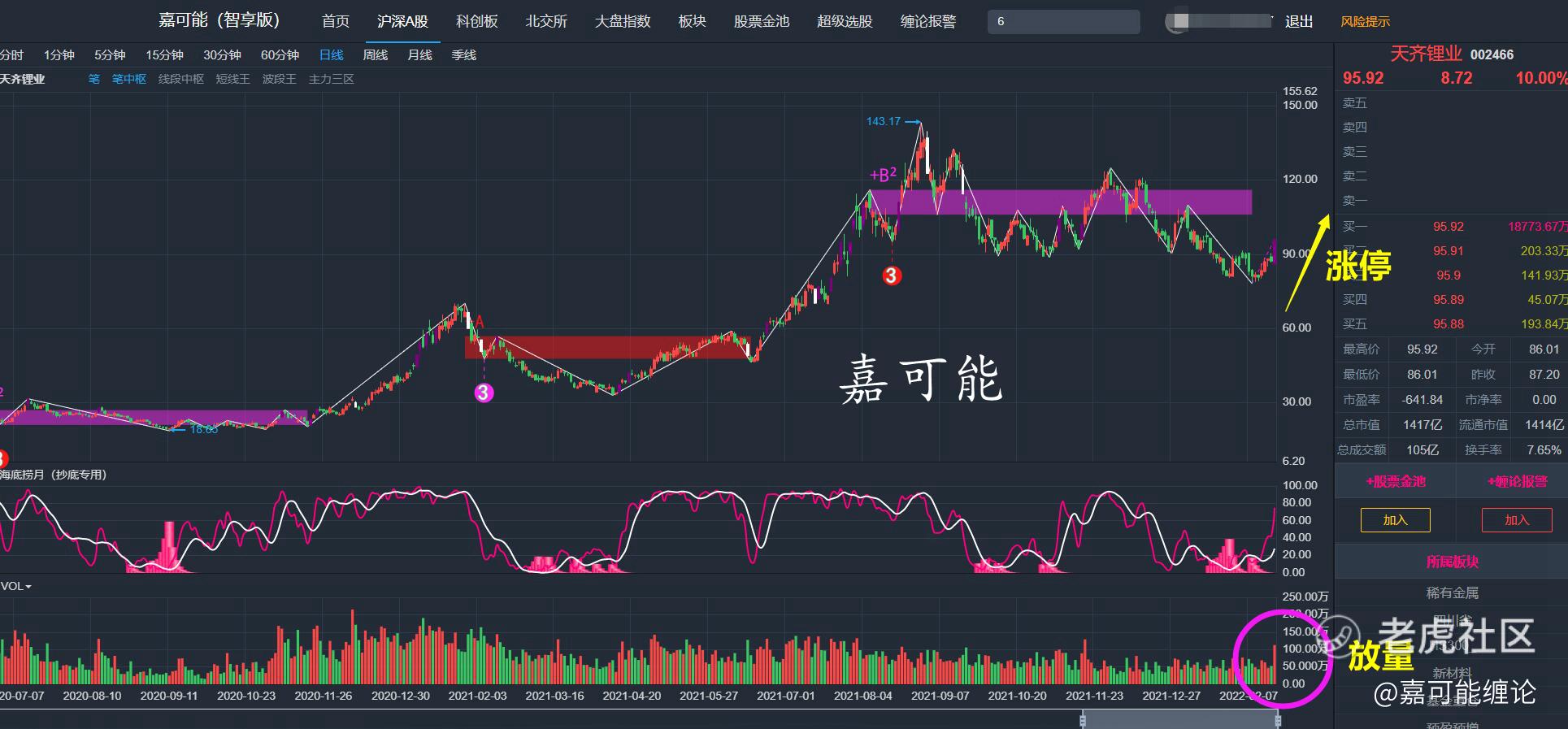 同样,锂电池龙头股,天齐锂业(002466)成交额突破100亿。我们说过,在沪深A股,某只股票成交额破100亿后,就容易形成标杆效益,意味着该板块短期就能成为热点。